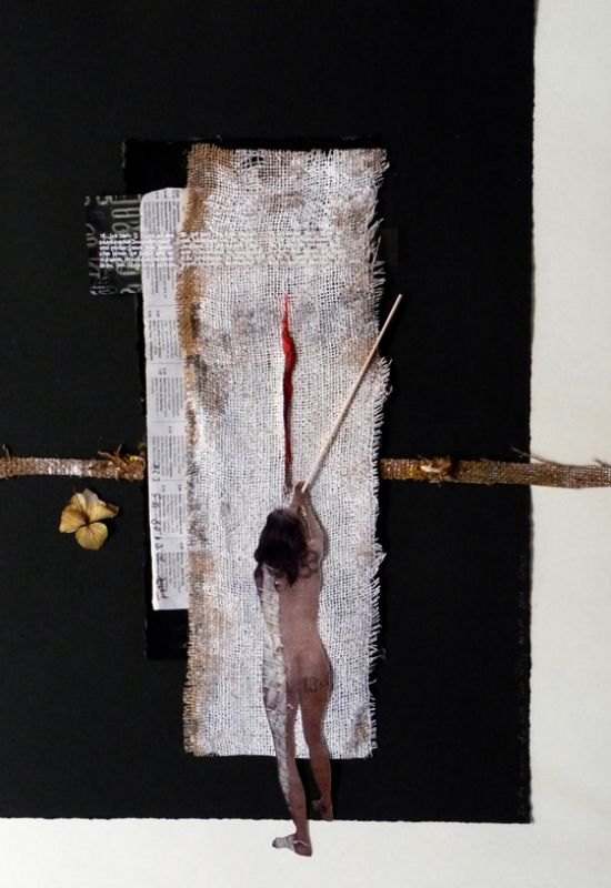 Diesen Appell und seine tatsächliche Umsetzung durch Partizipatorinnen realisiert sie in dem hier zu sehenden Werke. In einer Installation verarbeitet sie eine fotografische Serie von Personen, wie sie sich der Leinwand nähern, wie sie die Leinwand mit ihren Händen bearbeiten und den erneuten Einlass in die Welt „in der Nachahmung einer Geburt" erringen, indem sie sich durch die Leinwand hindurch zwängen und in einer Versinnbildlichung der Sehnsucht, „NEUES" zu schaffen, erleichtert vor ihr heraustreten.