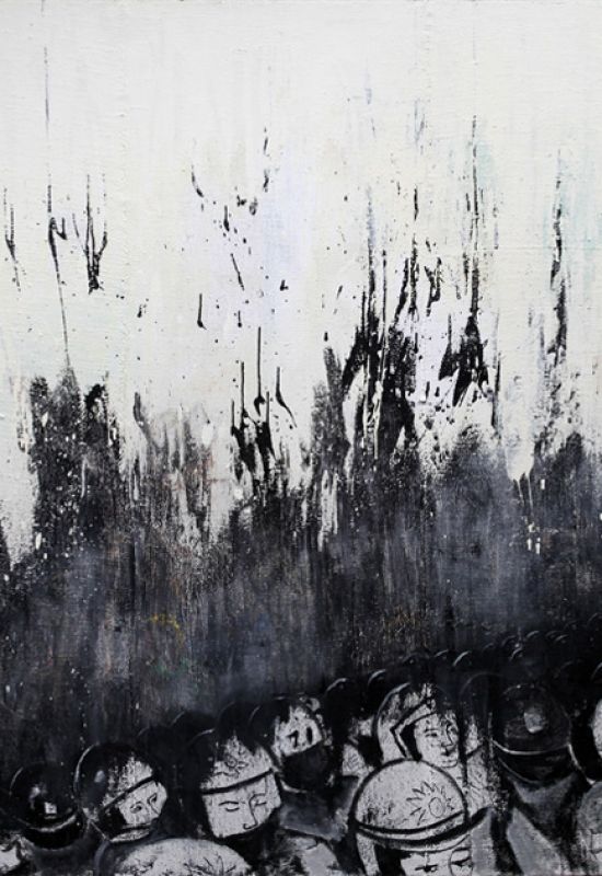 Die drei Bilder, von denen ich spreche, nennt sie „Übermalungen". Das Bild mit dem Titel „Das Volk über den Barrikaden" war ihr erstes Bild in dieser Vorgehensweise und hat einen kunstgeschichtlichen Bezug. Die Vorlage stammt von Eugéne Delacroix, „Die Freiheit führt das Volk" von 1830. An die Stelle der von Delacroix vormals eigens getauften barbusigen Marianne setzt Teréz Fóthy sich selbst, jedoch mit Besen und Pinsel statt Flagge und Gewehr in der Hand. Sie folgt damit der Tradition einiger Maler, sich selbst als Zeitgenossin in das Bild zu integrieren. Auch Delacroix hat sich mit Gewehr im Bild in Szene gesetzt, obwohl er an dieser Revolution im Juli 1830 nicht teilgenommen hat. „Habe ich schon nicht gekämpft, so will ich zumindest für unser Land malen". In Teréz Fóthys Bild sind gleich mehrere barbusige Frauen hineingezeichnet worden und behelmte Polizisten verweisen auf den Kampf gegen die heutigen diktatorischen Regierungen. Sich selbst und ihre Mitstreiterinnen hat sie durch ihre Übermalung wieder verschwinden lassen. Geblieben sind nur die uniformierten Polizisten, ein malerischer heller pastöser Hintergrund und eine schwarz-graue mit agressivem Duktus gepinselte Fläche über den Schutzhelmen (Dörner 2014)"
